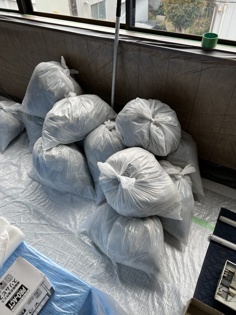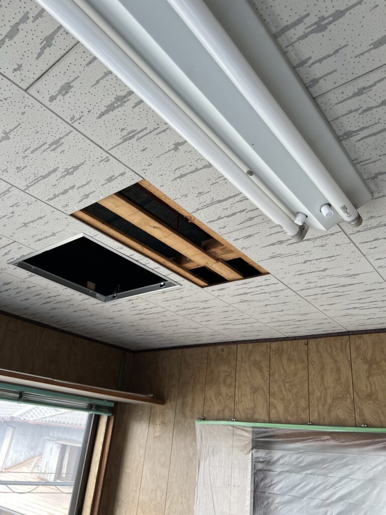 断熱材を撤去する為の開口が必要になる為、シミのついた天井材を撤去し、開口を作りそこから断熱材を全て撤去致しました。