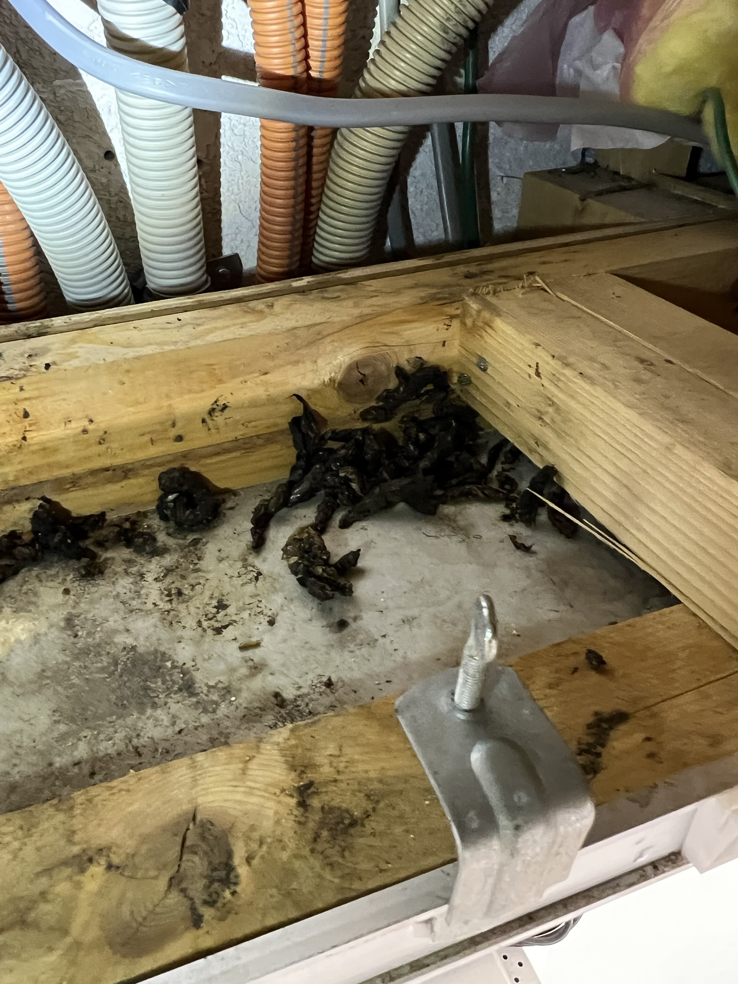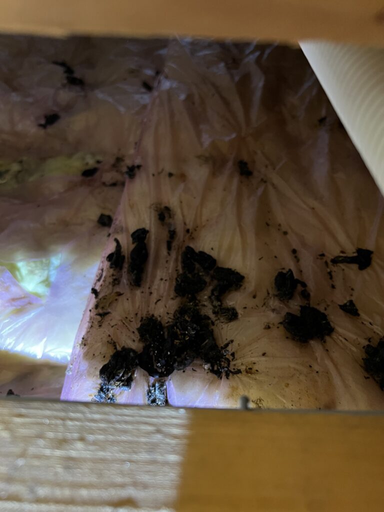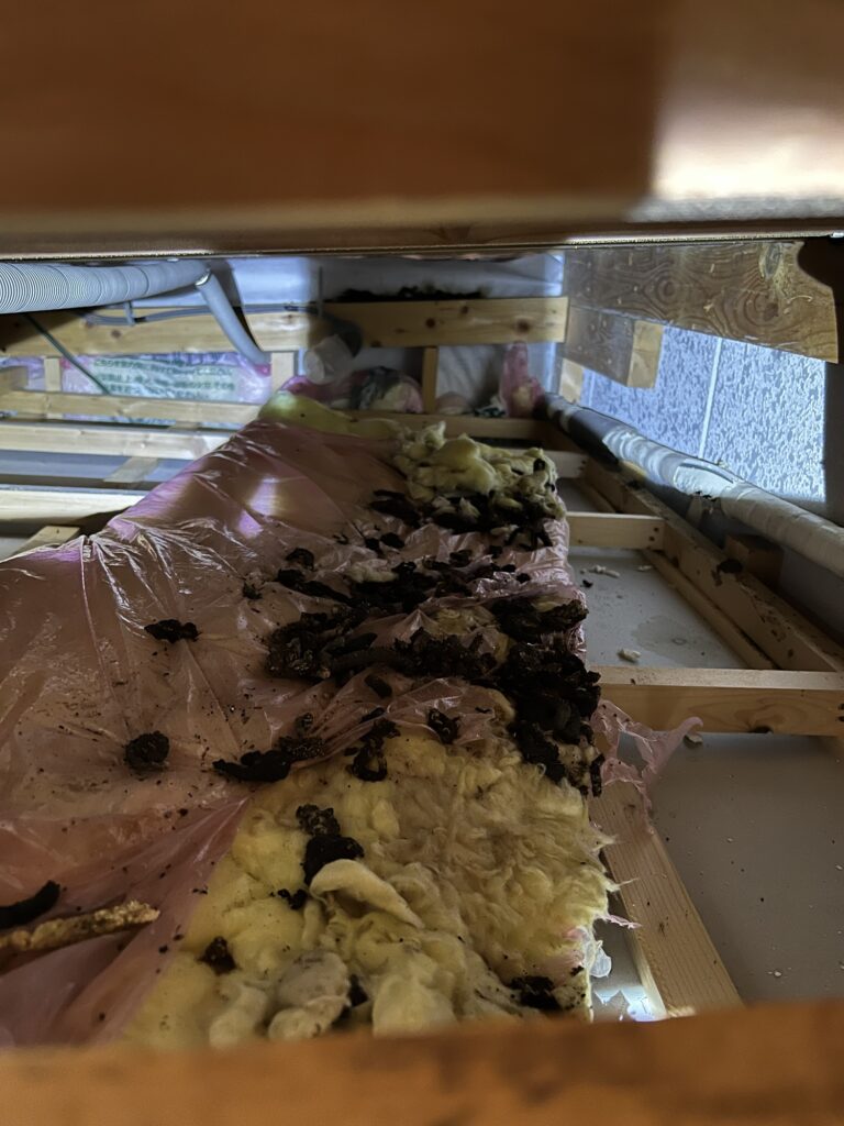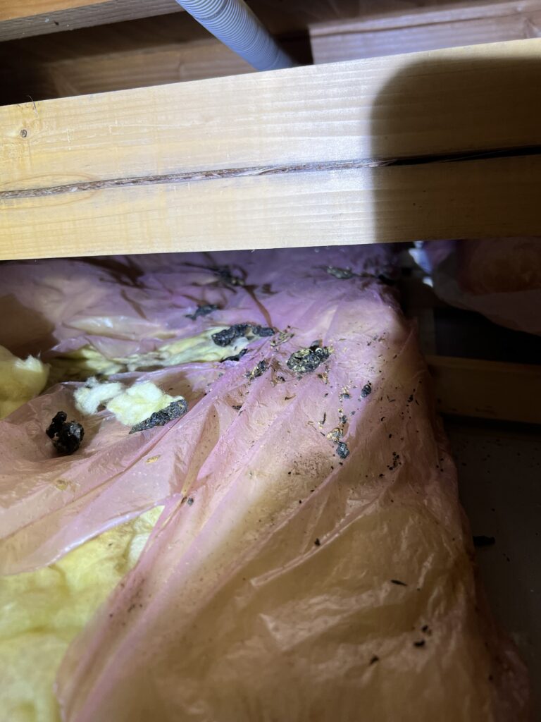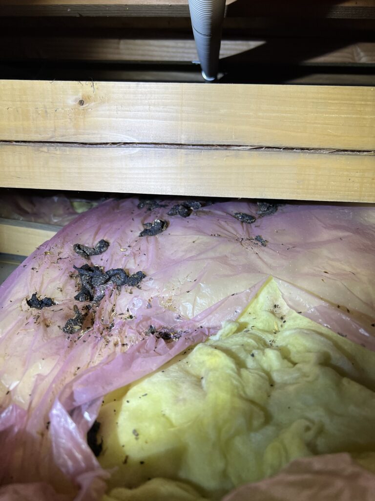 点検口から確認したところ、イタチの糞が天井全体にあり、断熱材も酷く荒らされてましたので数年は住み着いていたと思われます。